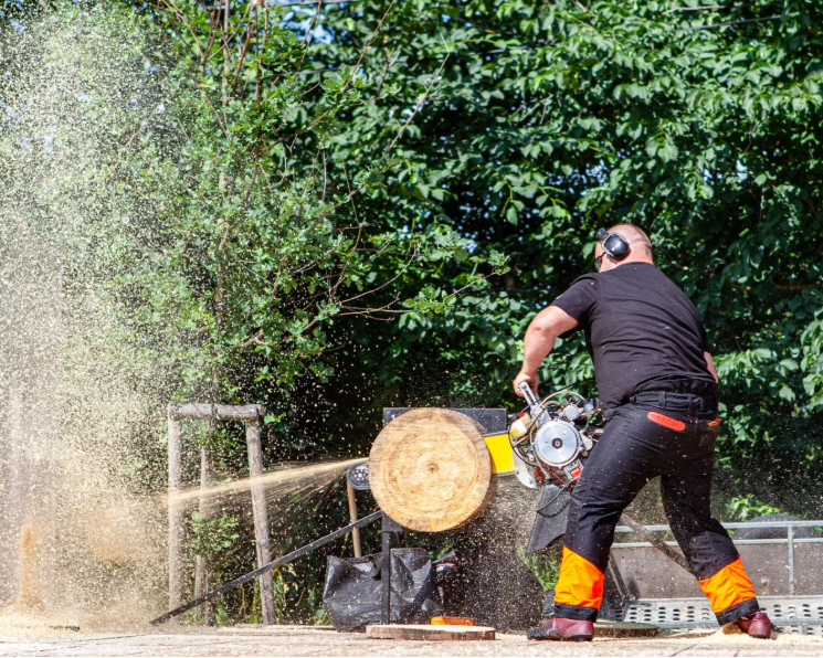 Královská, nejrychlejší a zaručeně nejhlučnější disciplína. Závodníci krotí na míru stavěné pily s výkonem přes 60 koní a váhou okolo 30 kg, jejichž řetěz rotuje rychlostí přes 240 km/h. Úkolem je odříznout z horizontálního kmene tři kompletní kotouče v úzké, 15centimetrové výseči. Udržet tuhle burácející bestii v rovině vyžaduje neskutečnou fyzickou sílu a ty nejlepší to zvládnou pod 6 vteřin.